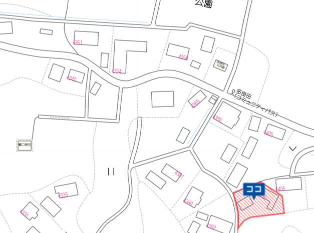 | 特記事項 | 現況渡しです。土砂災害警戒区域(イエローゾーン)に該当します。土地上に未登記建物があります。埋蔵文化財包蔵地に該当します。(多良田遺跡) | ||||||||||
